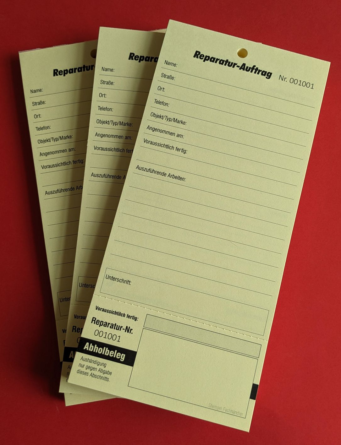 Format 10 x 20 cm Auftrags- und Abrechnungsformular für Werkstätten aller Art (Fahrrad, Krad, KFZ, etc) stabiler Karton 160g/qm geblockt (am Kopf verleimt) zu 50 Blatt beidseitig bedruckt mit allen relevanten Angaben ... siehe Bilder mit Abholbeleg für den Kunde die Formulare sind fortlaufend nummeriert ab Nr. 00001