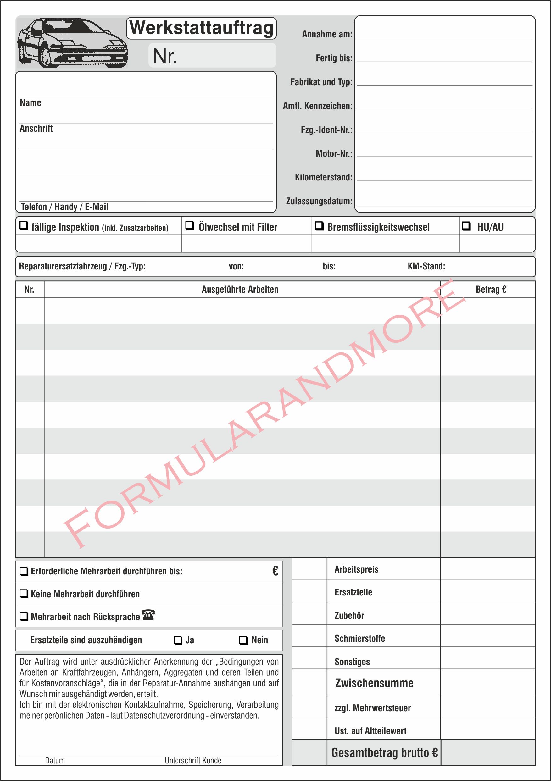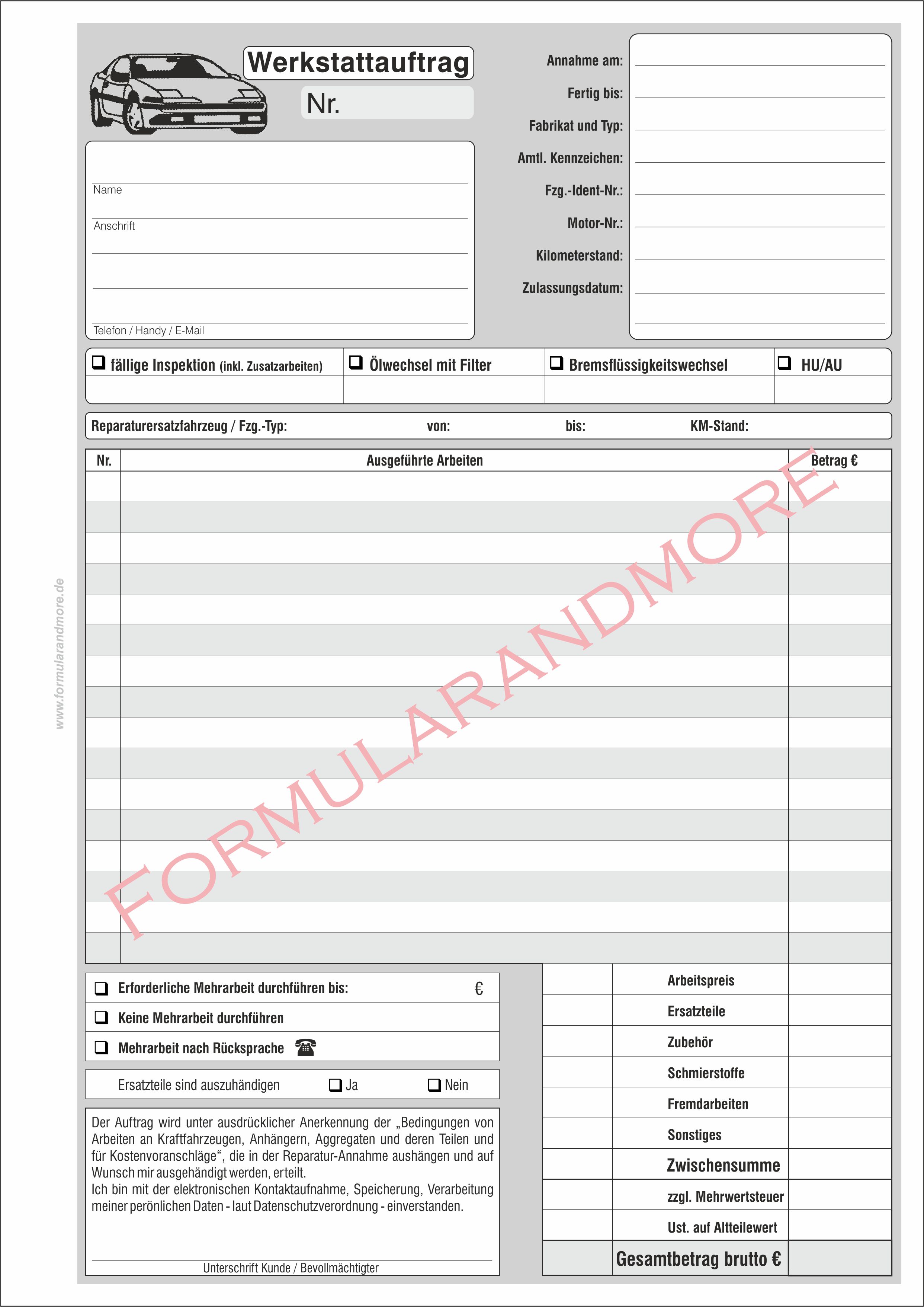 Auftragsformular für Werkstätten, stabiler Karton 160g/qm, beidseitig bedruckt | 100 Stück | nur 12,99 € |